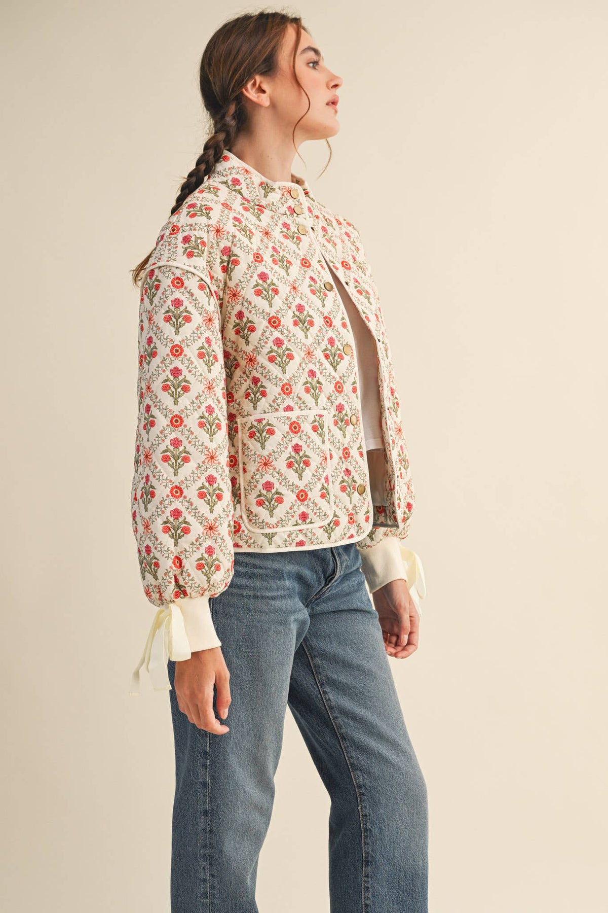 Our Reminder Ribbon is a floral quilted jacket with ribbon detail on the cuffs. This adorable reminder has a stand up collar snap button closure. We love everything about this jacket, for warmth and style.