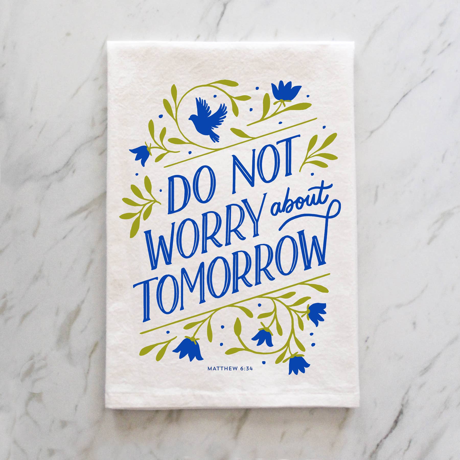 This tea towel serves as a bright & bold reminder of Jesus’ words in Matthew 6 to not worry about tomorrow. Hang this tea towel in your kitchen to remind yourself daily to “consider the birds of the air...and the flowers of the field” and not worry about tomorrow as you go about your daily tasks. Details: • 100% cotton towel, machine washable • 27x27in (printed area 9x13in on lower middle third) • Hanging loop on back • Designed & screen printed in Milwaukee, WI