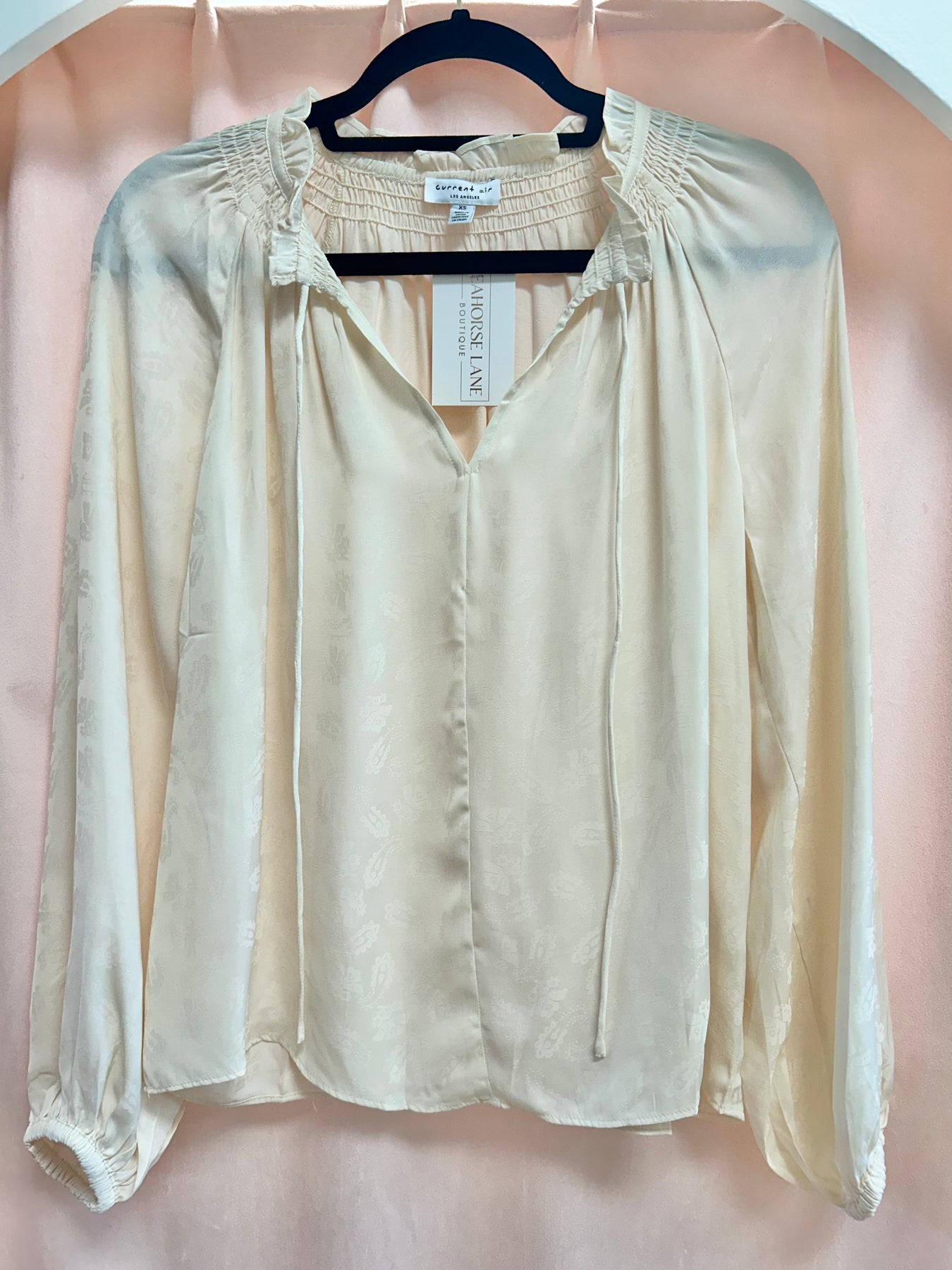 Adorable cream blouse featuring delicate paisley detailing that brings a touch of whimsy to your everyday wardrobe. The soft, neutral palette pairs effortlessly with jeans, skirts, or trousers, making it a versatile staple for any season. Perfect for those who love a hint of pattern without overwhelming their look. Dress it up or down—this charming piece does it all.