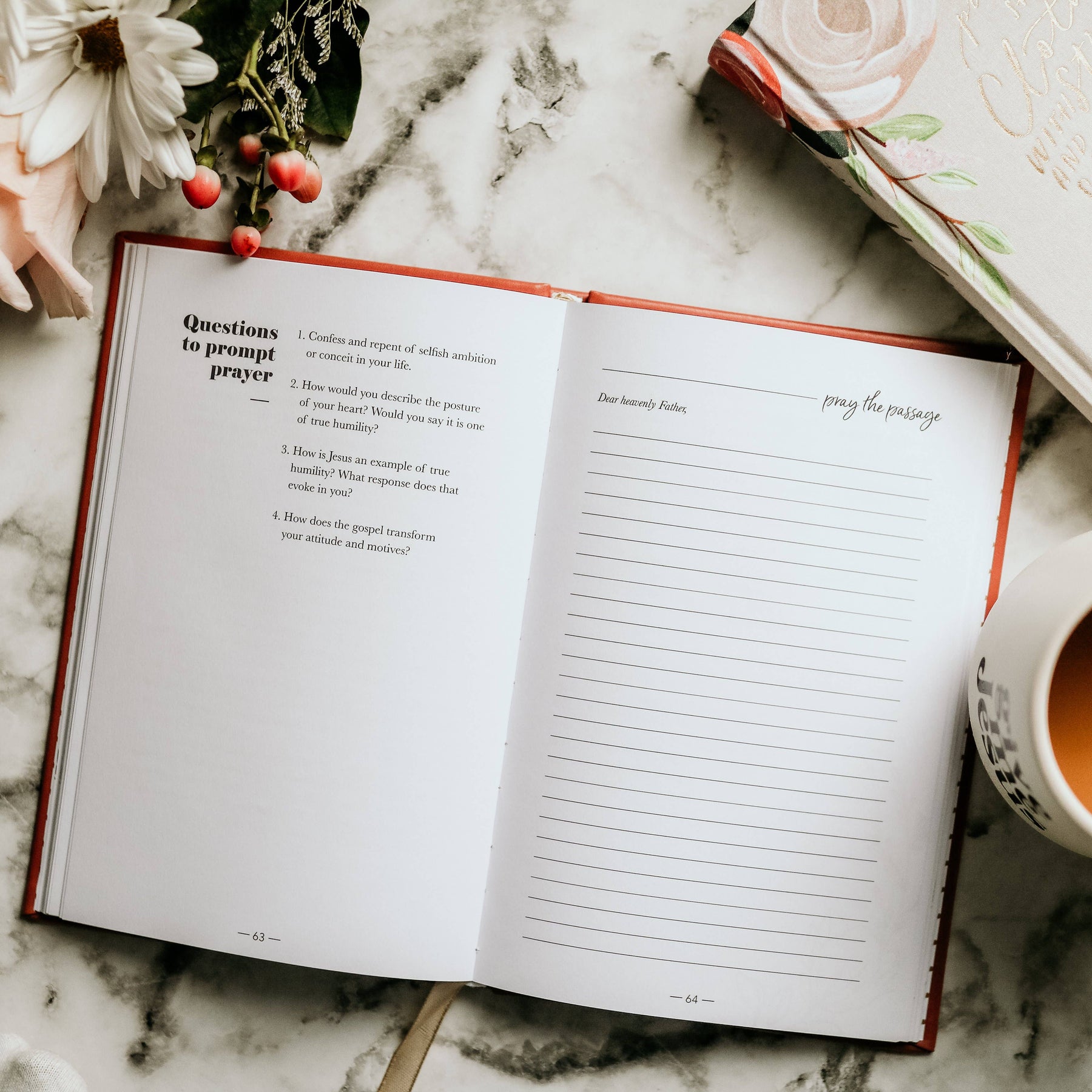 The journal features passages to pray printed directly in the journal, guided instructions on praying the Bible, commentary on the passage, guided prayers, and questions to prompt prayer.
