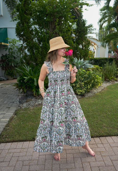 New in from designer Leighton Ann is "The Lizzy" shown in Cranberry and Green this Midi dress made with exceptional cotton and adorned with smocked tank-like sleeves and torso; Shown with pockets and some puff in the sleeves. All dresses by Leighton Ann are lined.