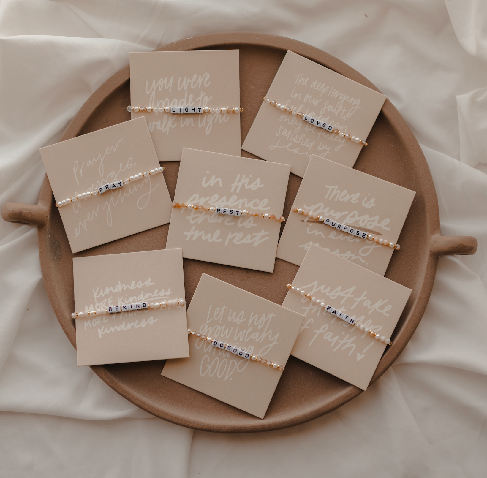 Do not be anxious about anything, but in every situation, by prayer and petition, with thanksgiving, present your requests to God. And the peace of God, which transcends all understanding, will guard your hearts and your minds in Christ Jesus. Philippians 4:6-7 Size: 6.75" one size fits most! Details: -beaded stretch bracelet -verse reference on attached gold tag -Display Card with artwork and details on back