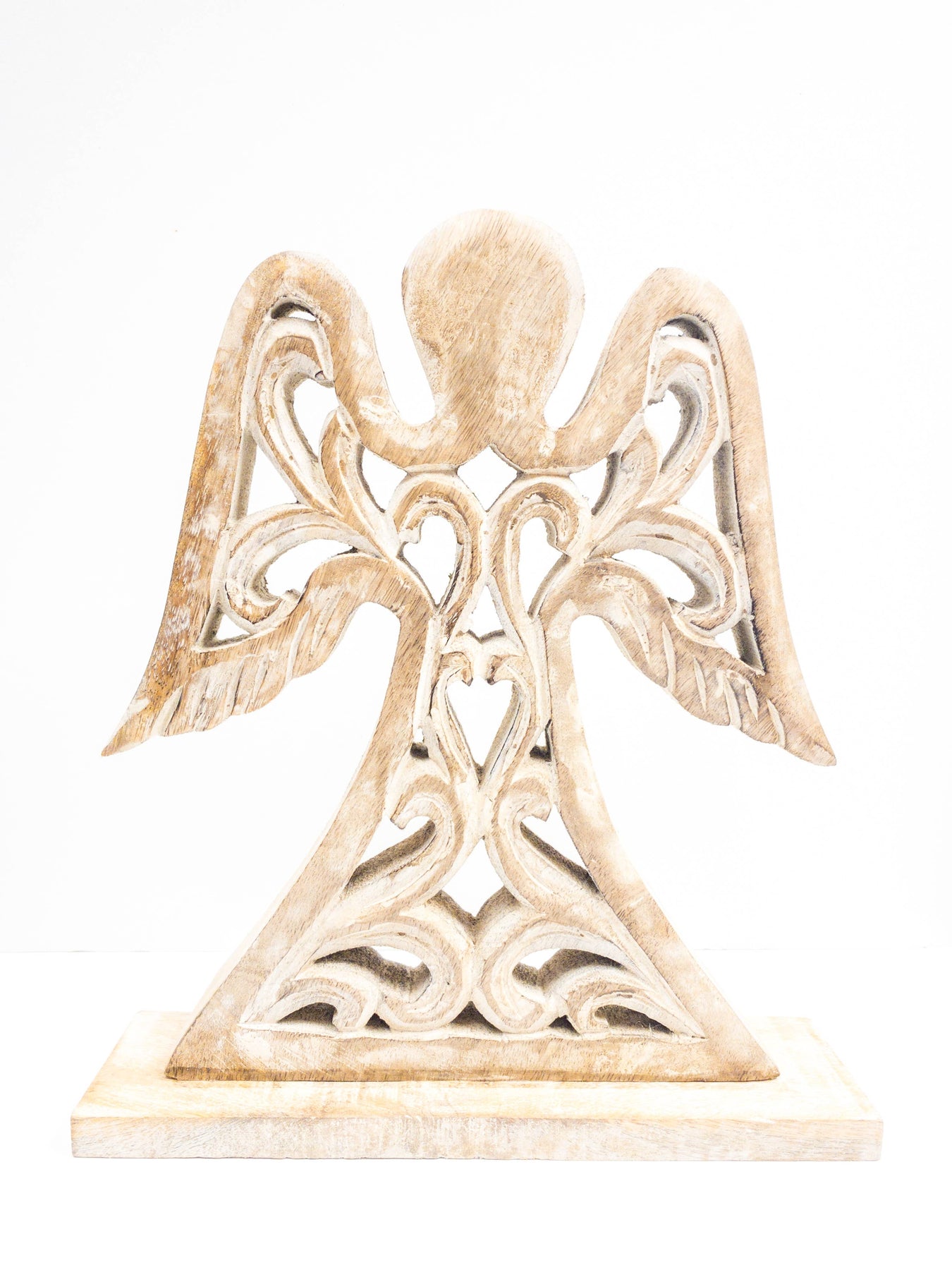 Add an angelic touch to your Easter decor. This intricately crafted whitewashed mango wood angel makes a perfect addition to any room, featuring an elegant simplicity that radiates a calming atmosphere. Expertly handcrafted by our artisan partners, whose family has been honing their craft for three generations. Dimensions: 12"H x 10"W. Great for Easter or any holiday decorating!