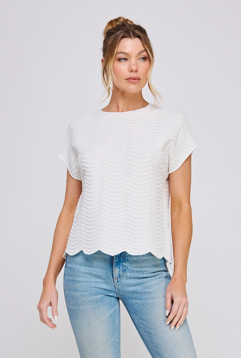 Effortlessly chic and undeniably cozy, this relaxed knit top features a delicate scallop pattern in a gorgeous Off-white that's impossible to resist. The fine gauge knit drapes beautifully while keeping things casual and comfortable—perfect for those days when you want to look put-together without any fuss. Throw it on with your favorite jeans or dress it up with a skirt for instant style that feels like a warm hug.