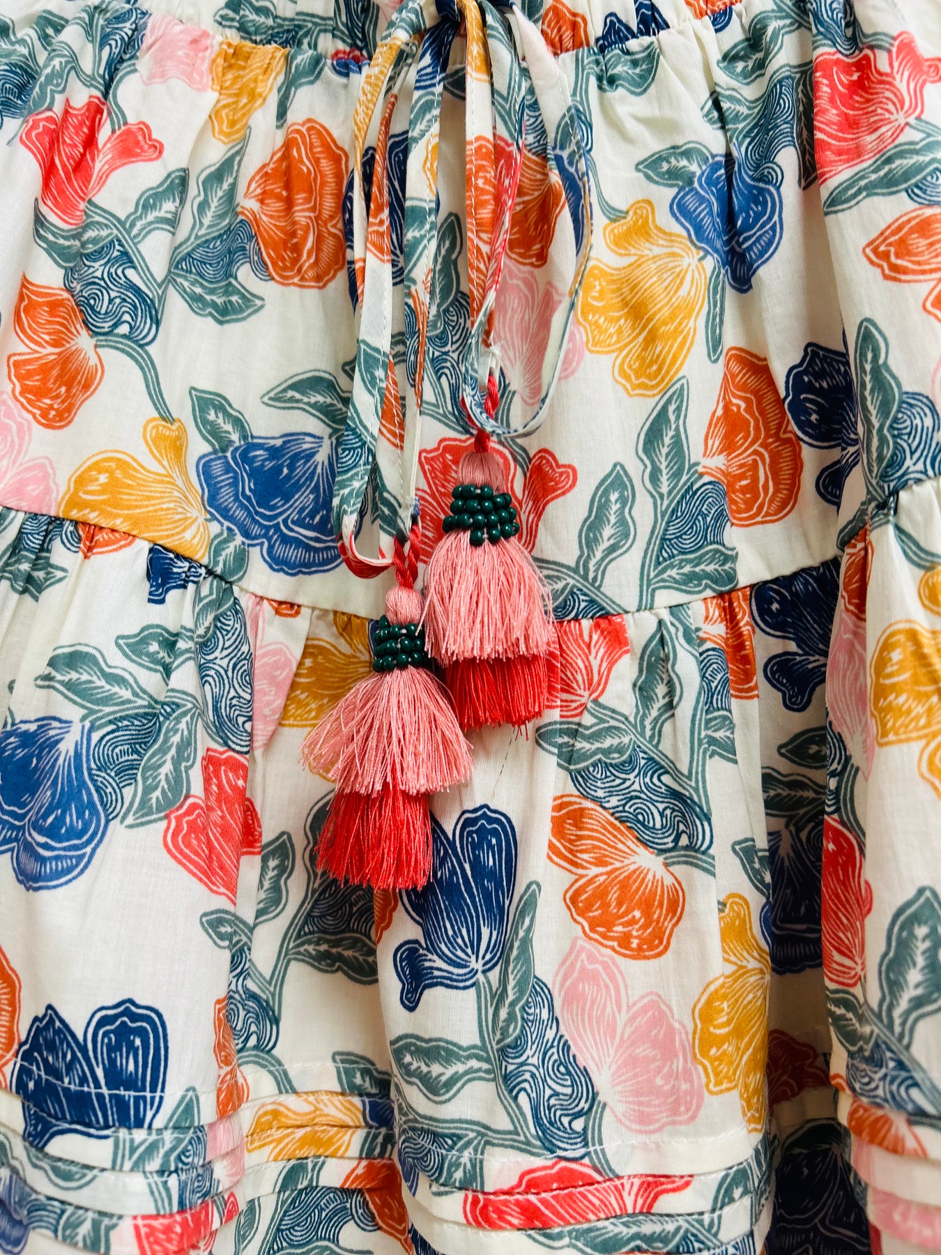 Twirl into spring with this charming floral tiered mini skirt that celebrates effortless femininity. Delicate blooms dance across soft, flowing layers that create movement with every step. We love that it is lined and has a sweet tossle belt tie. The playful tiered silhouette adds dimension and a touch of whimsy, perfect for pairing with your favorite top or make it a set with the Sown On Good Soil Top.